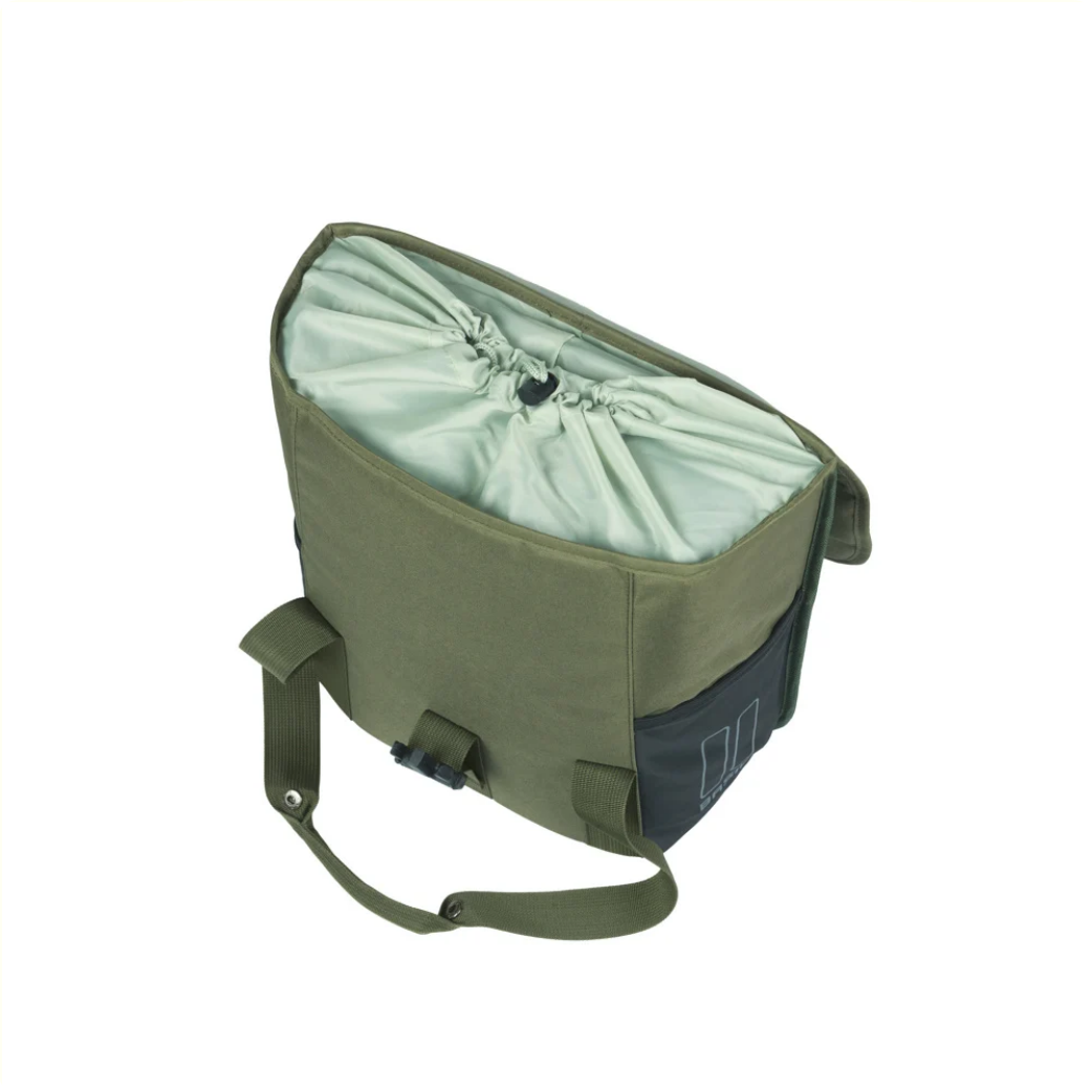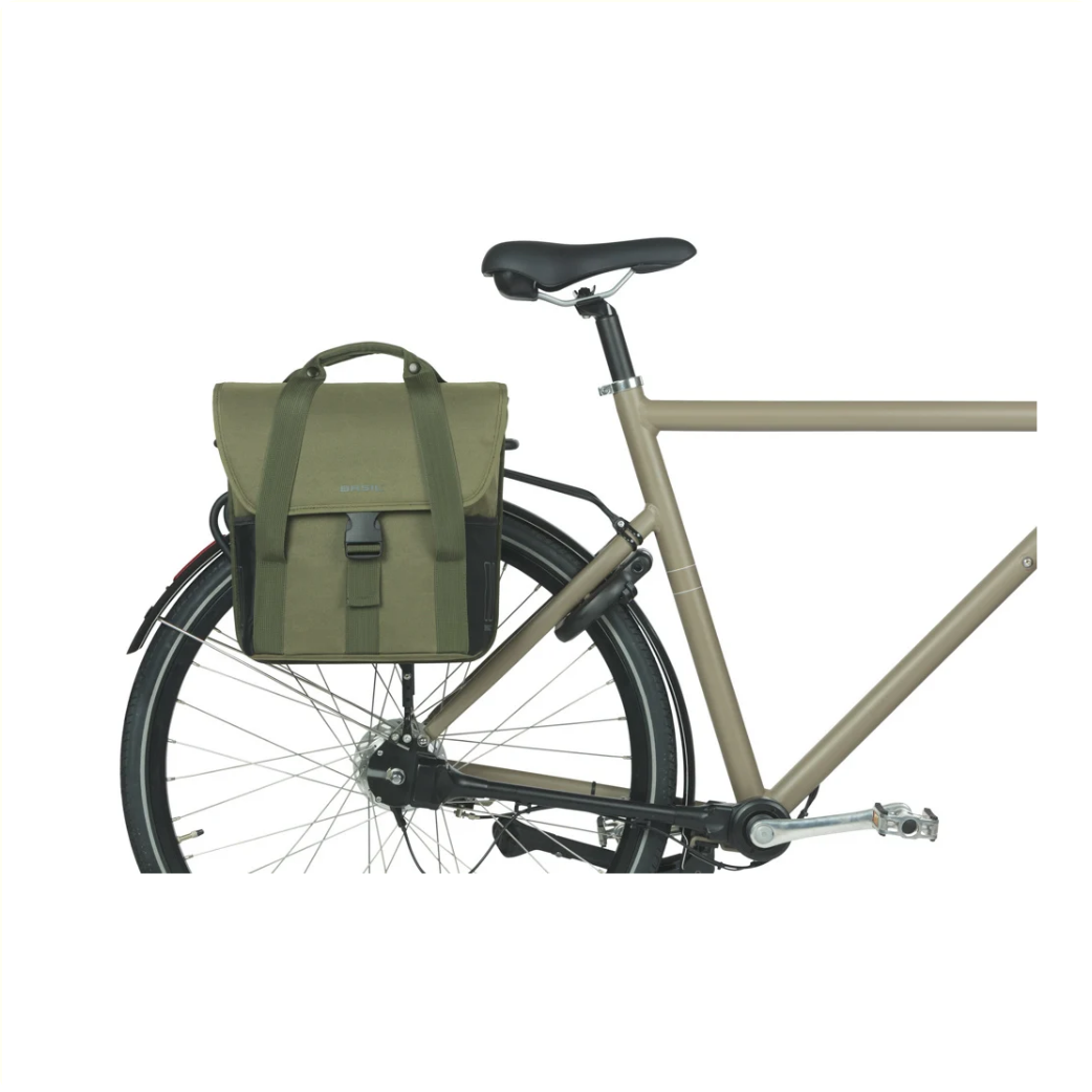 Basil GO-enkele fietstas voor achterop • polyester 900D • hoofdcompartiment met aansnoerkoord • dubbele elastische zijvakken • handgrepen • Hook-On system in ritsvak • dubbele en extra reflectie • inhoud 16L • afmetingen 29 cm x 15 cm x 34 cm