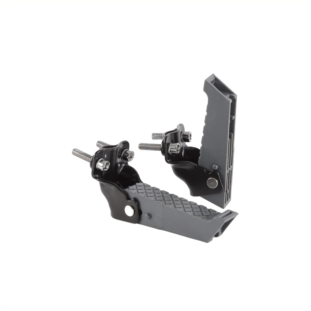 Mirage voetsteunen opklapbaar • grijs/zwart. • Voor montage bij drager (dmv stalen klemmen) • Uitgevoerd met antislip profiel en rubber riemen • Met RVS bouten en moeren