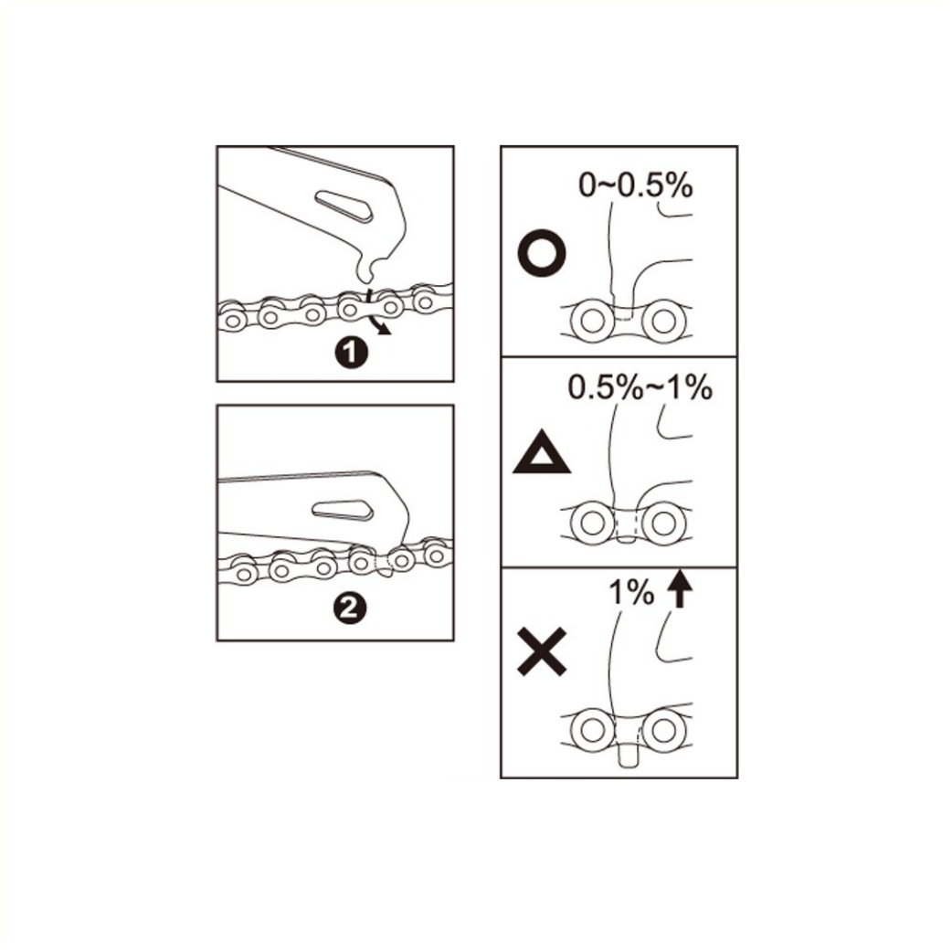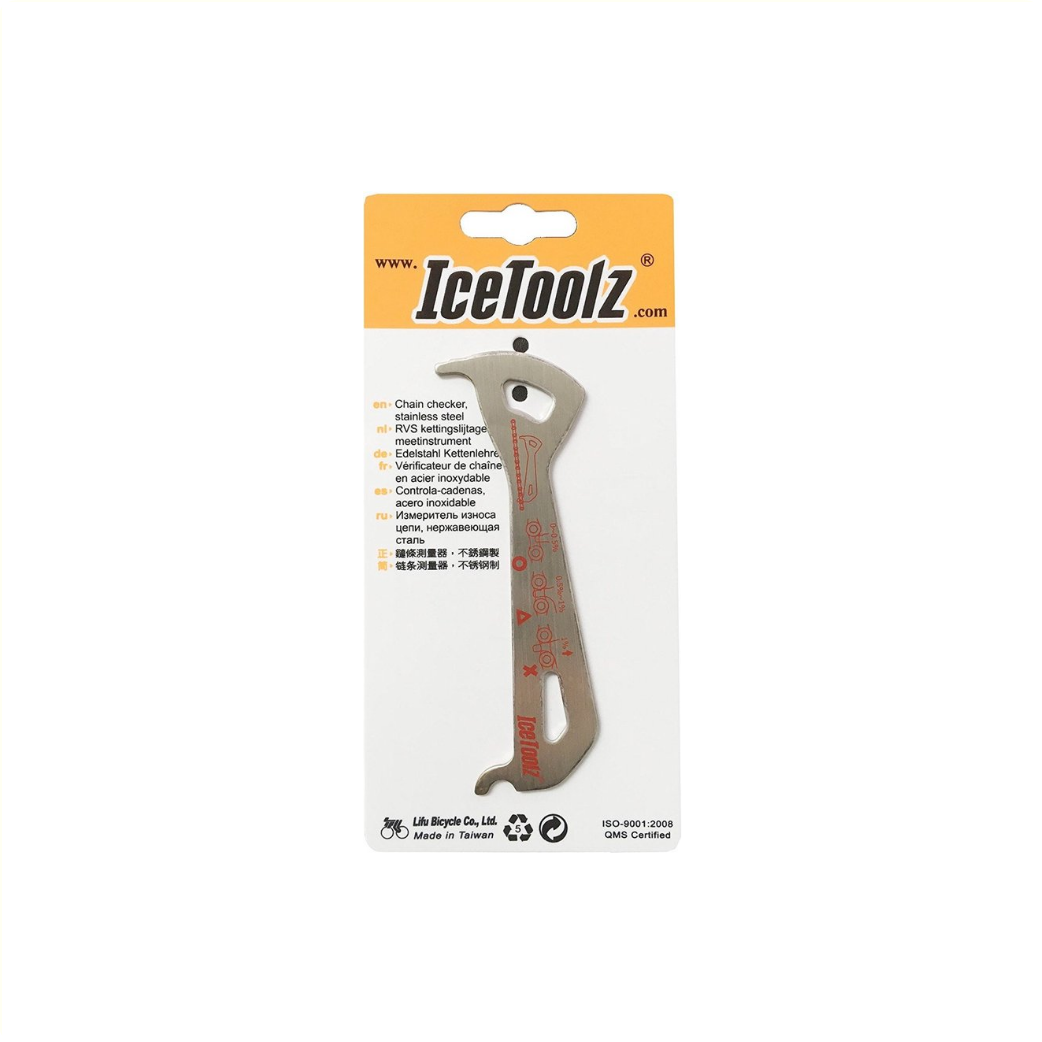 • Deze handige ketting-slijtagemeter van IceToolz laat zien wanneer de ketting aan vervanging toe is.