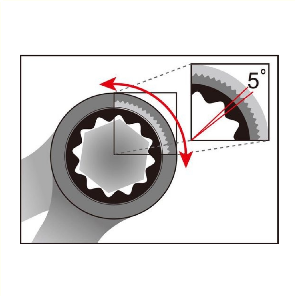 • Met ratelontgrendeling per 5° aan ringsleutelzijde.