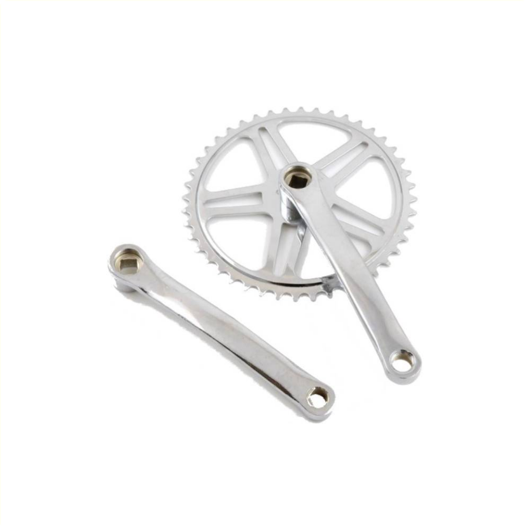 Vinty crankstel 44T 1/8“, crank 170mm • staal • Chrome Plated • 44T • Geschikt voor 1/2“ x 1/8“ ketting • Geschikt voor 9/16“ schroefdraad pedalen • Geschikt voor JIS trapas (vierkante aansluiting) • Spieloos
