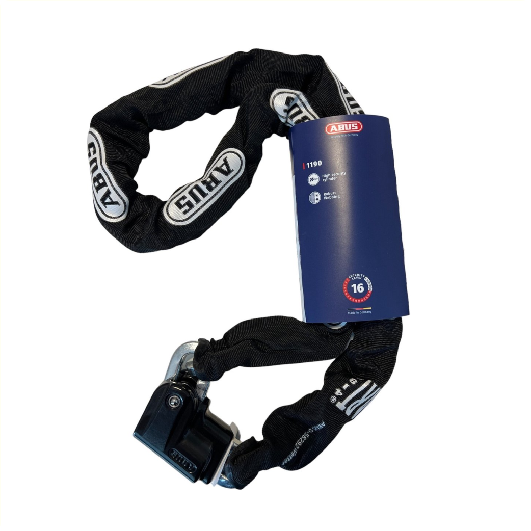 • 11 mm dikke vierkant ketting met textielhoes om lakschade te voorkomen