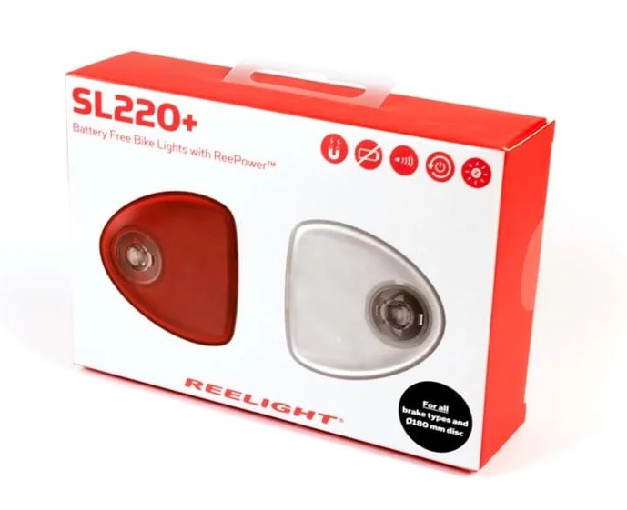 Reelight SL220+ Reepower set, Flash. • Voor en achter knipperende fietsverlichting. • Blijft bij stilstand nog 2 minuten knipperen. • Voeding dmv wiel magneten. Geen batterijen nodig. Geschikt voor fietsen met roller- of discbrakes.