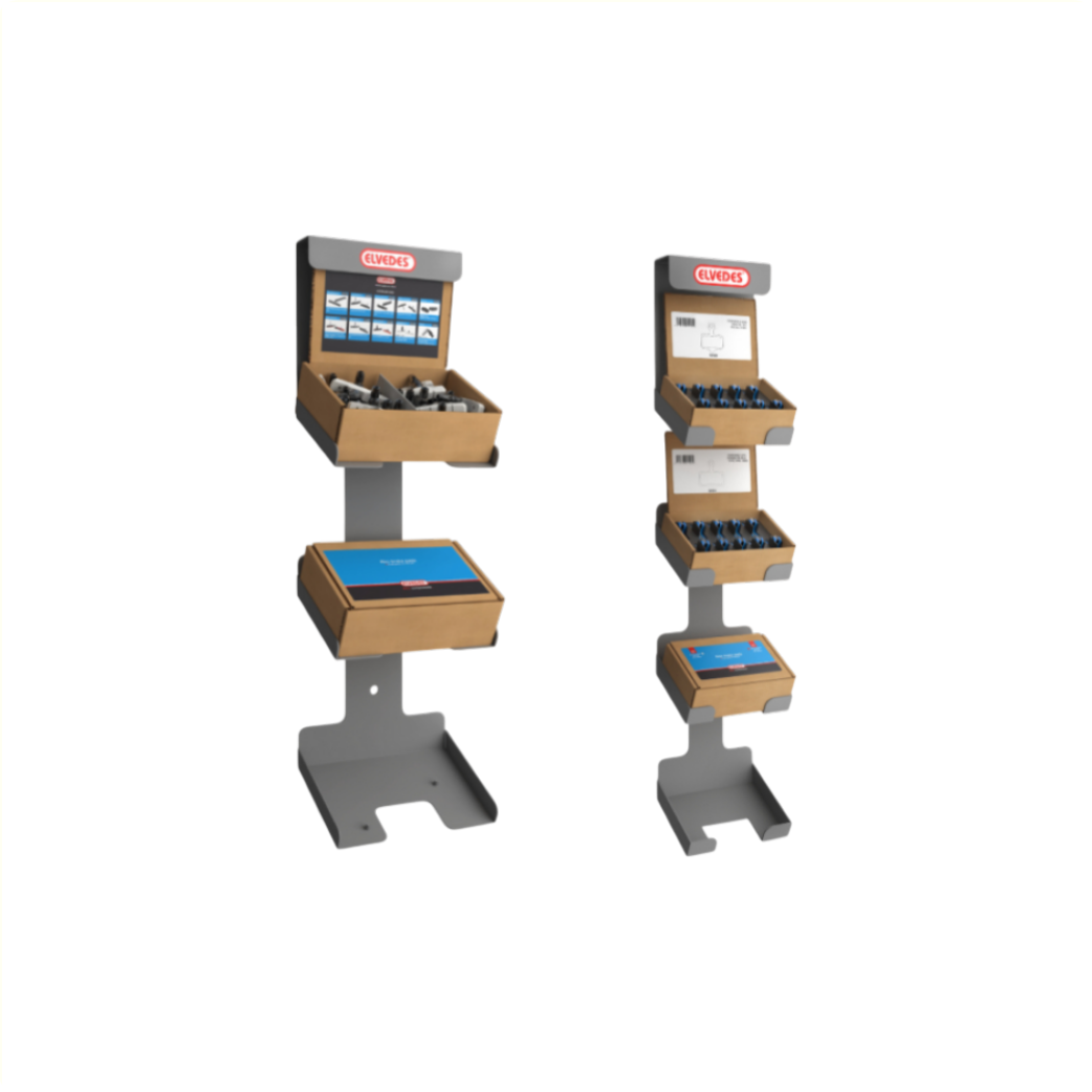 Elvedes Caddy display. • Geschikt voor 3 werkplaats dozen remblokken met 25 sets en/of derailleur wieltjes. • Wordt geleverd zonder inhoud.